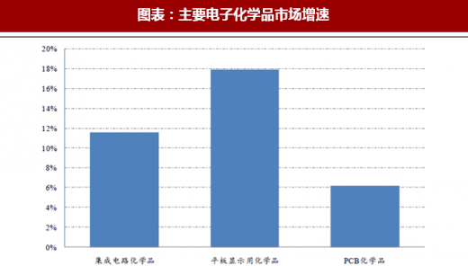 受益于我国庞大的电子产业,我国电子化学品材料市场亦保持了快速发展。2007-2015 年我国电子化学品年复合增长率 15.4%,超过全球增长水平,也超过电子产业增速。从具体品种看,电子化学品材料主要包括集成电路化学品、平板用化学品、pcb 化学品等,其中集成电路化学品和平板显示用化学品增长较快。