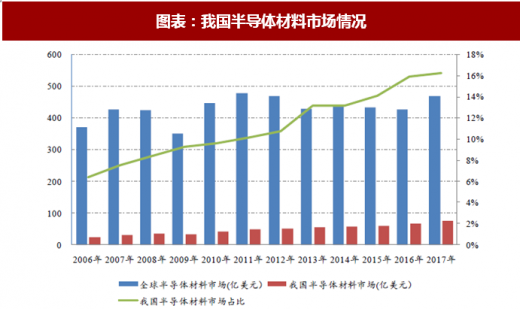 2017 年我国半导体材料市场总量 76.2 亿美元,占全球市场总量的 16.2%,近年来占比持续提升。但与我国电子产业 40%以上的市场份额相比,半导体材料的自给率较低,其中高端领域半导体材料的整体国产化率不到 10%。