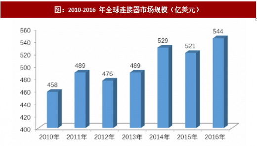 连接器应用领域广泛,近年来,其全球市场规模总体保持了增长的态势。根据出货情况及市场预测报告,连接器的全球市场规模已从2010年的458亿美元增长到2016年的544亿美元,年复合增长率为2.91%。据预测,2017年全球连接器市场规模将达630亿美元。