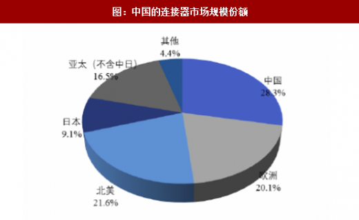 受经济持续30年的高速增长影响,我国汽车、通信、计算机及外设、工业、消费电子等连接器下游市场发展迅速,有力带动了我国连接器市场的发展。在全球连接器的5个主要市场中,我国发展速度最快,2003年我国连接器市场规模仅占全球总市场规模的10.77%,在5大市场中排名最后,经过多年快速发展,到2012年开始成为全球最大的连接器市场。2015年,中国的连接器市场规模份额达到全球的28.3%,是全球唯一占比超过1/4的区域。