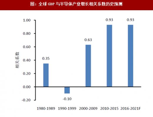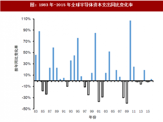 半导体与宏观经济的相关系数高。根据国际半导体权威研究机构ic insights的研究,2000年~2009年,全球gdp增速与半导体产业增速的相关系数达到0.63,2010年~2015年相关系数高达0.93,预计未来5年相关系数仍将维持0.93的水平。1983年~2016年全球半导体资本支出变化率表明半导体行业具有显著的周期性。