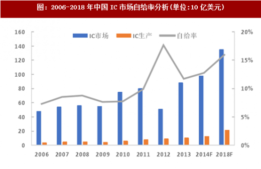 中国ic自主生产量与消耗量差异极大,自给率仍然处于较低水平。根据ic insights的数据,中国ic市场自给率在2008年仅为8.7%, 2014年为12.8%,预计2018年为16.0%, 2018年供需缺口将达到1135亿美元。因此国内自2014年《集成电路发展纲要》发布以来,各地陆续新建大量晶圆代工厂,以满足国内市场需求。