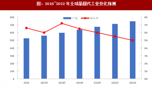 据digitimes research的研究,在2017年至2022年期间,因智能手机搭载ic数量增加与对先进制程需求提升,加上包括iot, ar/vr、汽车电子、高效能计算市场有望在未来5年进入成长期,预测2017年全球代工增长6%,达到557亿美元,到2022年时将达746.6亿美元,2017年至2022年复合成长率((cagr)将为6% 。 2017年台积电预估增长7%以及其在全球半导体晶圆代工市场的市占率达56% 。
