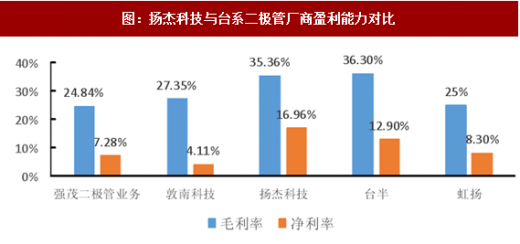 在成熟产品线领域,大陆厂商具有成本优势。二极管产品线,大陆龙头厂商扬杰科技的盈利能力远远高于台系厂商。