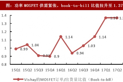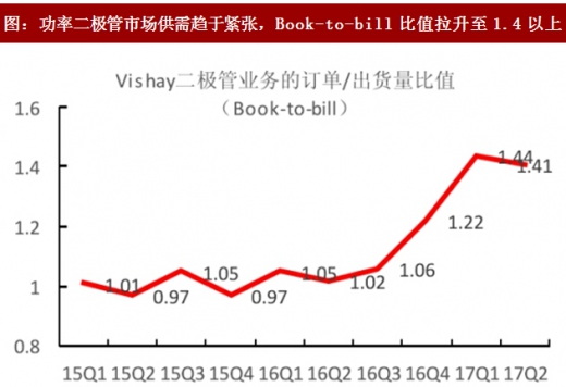 功率二极管市场供给紧张,行业龙头交货期大幅延长。从今年二季度开始,visahy的订单量暴增,订单出货量比值达到1.22,三季度vishay订单出货比值进一步攀升至1.44,中高端二极管市场进入前所未有的景气周期。
