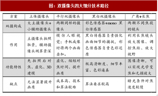 双摄四大细分技术路径中,黑白双摄像头对于画质提升效果最为明显,算法要求也比较高,而广角 长焦的摄像头组合,通过两个不同焦段的镜头,放大视野的同时有效调焦,实现图像无损放大,画质更清晰。这两种方案现在是手机双摄的主流方案。