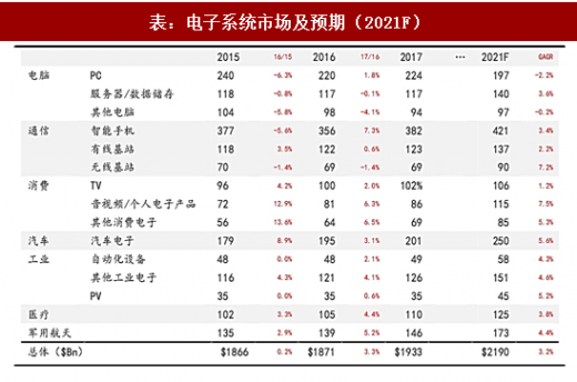 由于pcb下游的多元化,行业整体受单一行业影响较小,因此印制电路板行业的周期性主要体现为随着宏观经济的波动和电子系统市场的趋势而波动。pcb行业增长率与全球gdp增速周期相符。2016 年主要受到和市场衰退(2017 年后有望止跌回升)、智能机市场饱和以及宏观经济下行的影响出现负增长。但在经济回暖和下游应用的拉动下,行业景气度持续上行。