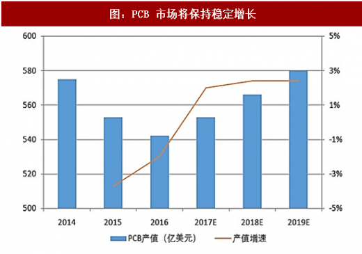 2016年全球pcb市场产值达到542亿美元,受主要下游市场pc、平板市场衰退、智能机市场饱和影响,相比2015年有2%的下滑。未来在全球电子信息产业持续发展的带动下,2016-2021年pcb市场有望保持2.2%的复合增速,实现稳定增长。