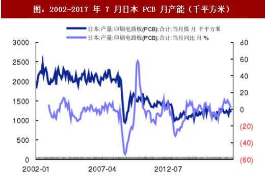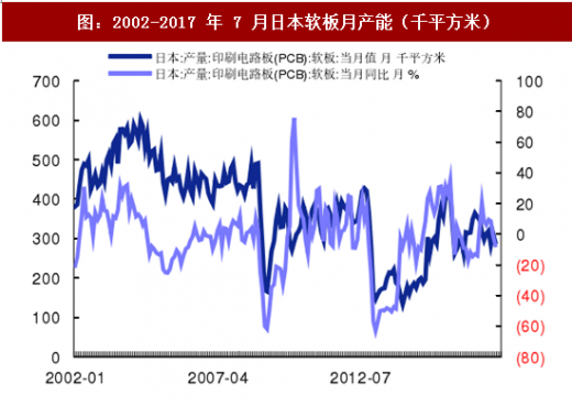 伴随着日本电子产业制造规模的下滑,pcb 作为其基础元器件,也呈现出下滑的趋势,尽管日本在高端 hdi、软板及载板方面仍占据技术优势,但是整体的份额逐步萎缩。日本产业经济相关数据表明,截止 2017 年 7 月,日本印刷电路板(pcb)月产能由 2002 年 5 月 220 万平方米下滑至 123 万平方米,相应地软板产能由 2002 年 5 月 50 万平方米下降至 29 万平方米,产能下降约 42%。