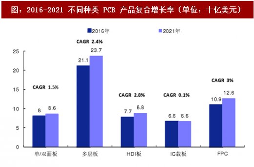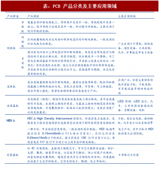 pcb 主要分为刚性板(单面板、双面板、多层板)、柔性板、hdi 基板、ic 封装基板以及金属。2016 年全球 pcb 总体规模下降 2%,其中,hdi 板、封装基板、fpc 分别下降 4.1%、 5.1%、7.6%,fpc 主要是由于 pc、等智能终端需求疲软,而 ic 封装基板的下滑主要归因于苹果 a10 处理器技术的更新,仅有单/双面板和多层板分别上涨 1.1%、1.8%。