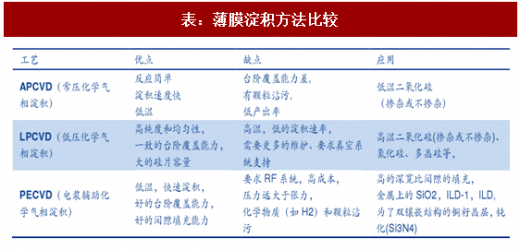 cvd 是半导体制程中应用极为广泛的薄膜制成方法。介电材料、导体或半导体等薄膜材料几乎都用 cvd 技术完成。常用的 cvd 技术包括常压化学气相淀积(apcvd)、低压化学气相淀积(lpcvd)、电浆辅助化学气相淀积(pecvd)等。
