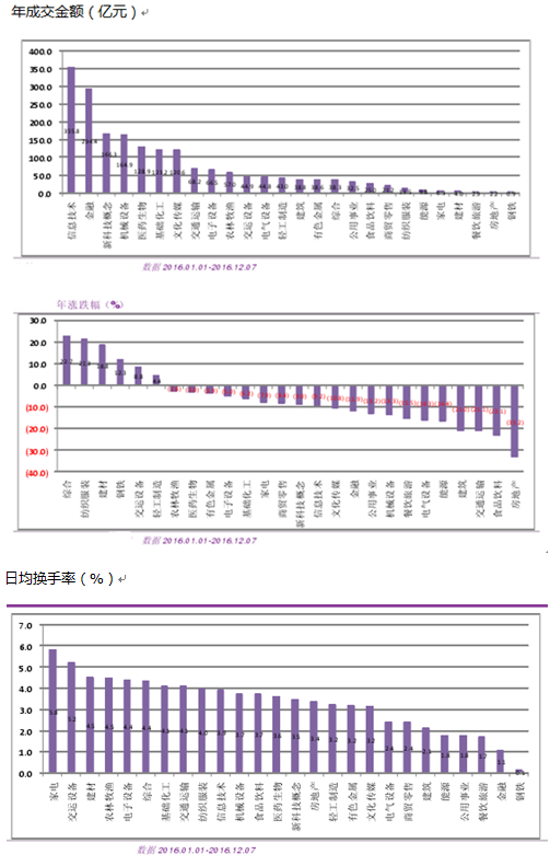 新科技概念板块成交量和成交金额位居新三板各行业前列:2016 年,对比东财新三板一级行业,新科技概念板块成交量为 23.2 亿股,居各行业排名第 4,仅次于金融、信息技术、机械设备等行业;成交金额为 166.3 亿元,居各行业排名第 3,仅次于信息技术、金融等行业;涨跌幅为-9.0%,居各行业排名第 14;日均换手率为 3.5%,居各行业排名第 14。