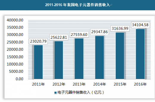 电子元器件制造业是电子信息产业的基础支撑产业。二十世纪九十年代起,通讯设备、消费类电子、计算机、互联网应用产品、汽车电子、机顶盒等产业发展迅猛,同时伴随着国际制造业向中国转移,中国大陆电子元器件行业得到了快速发展。从细分领域来看,随着4g、移动支付、信息安全、汽车电子、物联网等领域的发展,集成电路产业进入快速发展期;另外,led产业规模也在不断扩大,半导体领域日益成熟,面板价格止跌、需求关系略有改善等都为行业发展带来了广阔的发展空间。资料显示,2015年我国电子元器件行业销售收入约为31636.99亿元。2016年我国电子元器件行业销售收入达到34104.58亿元,同比增长7.8%。