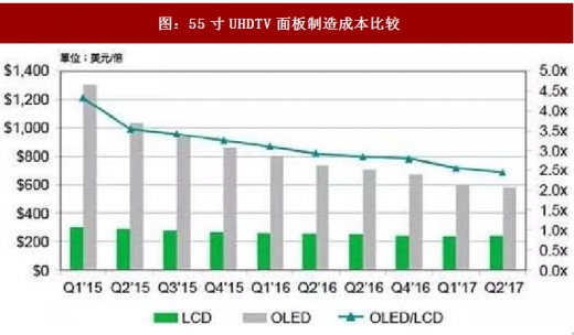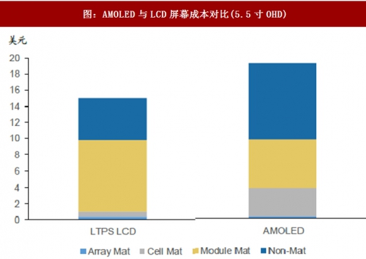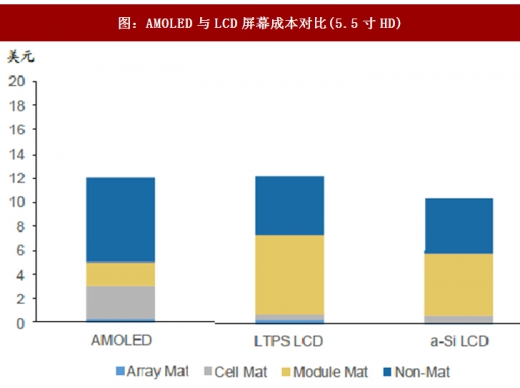2017年42以来,5.5寸hd分辨率的面板已经出现了成本倒转,根据ihsmarkit调查,5.5寸hdamoled面板的制造成本为12.1美元,而5.5寸hdl下pslcd面板的成本则是12.2美元,不过5.5寸的hda-silcd面板制造成本仅约10.4美元,仍低于amoled面板。在较高解析度的市场上,lcd的制造成本仍占有优势,据估计,5.5寸的ohdamoled面板和5.5寸的ohdl下pslcd面板之间,大约存在30%的成本差距,至于a-si技术则无法达到ohd的解析度。因为amoled结构较lcd面板简单,所以原则上amoled的材料成本应该低于lcd面板,amol印较高的成本主要来自折旧、劳动力成本等其他费用,而这些费用的单位成本将随着量产的规模效应而减少。