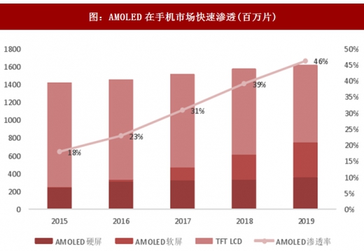 amol印面板在智能手机显示面板市场的渗透率正在迅速攀升。根据统计数据显示,2016年全球智能大概有23%搭载oled面板。2017年随着苹果十周年纪念手机iphonex采用amoled屏幕,掀起了oled热潮。据日本经济新闻报道,2018年下半年所有新款iphone都将采用oled屏幕。而这将会大大加速其他智能手机制造商对oled屏幕的采用,下rendforce指出到2020年,oled屏幕在手机上的采用率将达到50%。