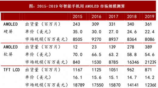 2017年全球amoled市场出货预计将达252亿美元,比2016年增长63%。预估到2021年,amoled面板市场将以22%的复合年增长率扩张,超过400亿美元。