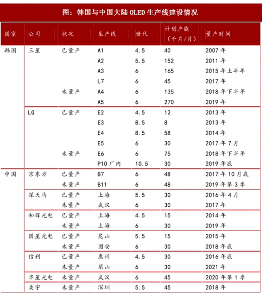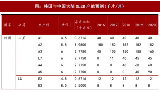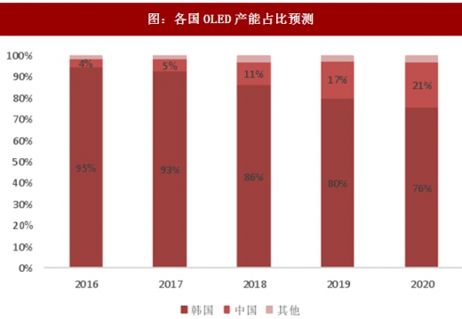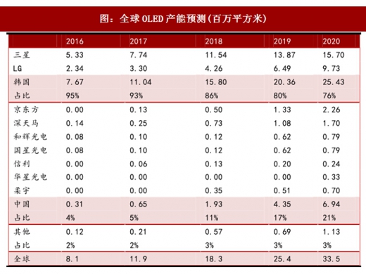 全球amol印面板供给集中在韩国,其中三星主要推中小尺寸的红绿蓝(rgb)oled面板,应用于智能手机及可穿戴设备等移动终端,占有市场份额超过95%;而lgd则主要推大尺寸的白光oled(woled)面板,主要应用在电视机上。为应对在智能手机和其他移动设备领域,液晶显示屏(lcd)逐步被rgbol印取代的趋势,特别是ol印面板全屏以及柔性的特性,乐金显示器已经于2017年开始生产rgboled面板。目前我国内地面板制造商也在针对移动设备积极扩大中小尺寸的rgbol印面板产能。全球ol印面板产能将在未来三年高速增长,扩张主要来自韩国和中国大陆。