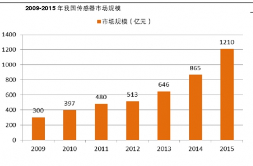 传感器行业目前主要由美国日本德国几家龙头公司主导,包括博世、意法半导体、德州仪器、英飞凌等,我国已基本掌握中低端传感器技术,但技术含量较低,市场份额较小。从2009年到2015年,国内传感器市场年均增速在20%以上,2015年市场规模达到1210亿元。