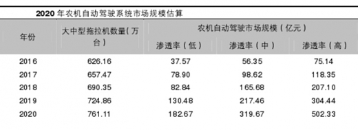 我国2014年大中型拖拉机数量为568万台,保守仅以大中型拖拉机为农机自动驾驶的主要应用对象,假设拖拉机数量2015-2020年复合增速为5%,我们分别以2020年4%, 7%,11%的农机自动驾驶渗透率来估算市场规模,假设平均每套农机自动驾驶设备为6万元,保守预计2020年市场规模183亿元,乐观预计502亿元。