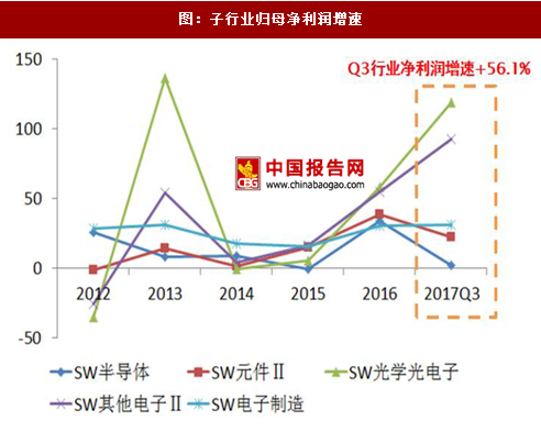 此外,子行业电子制造占行业利润比重排名第二(占比33.3%),但对行业利润波动影响较低,原因在于电子制造的净利润增速相对平稳,区间波动较低(2012-2017利润增速在15.7%-31.2%的区间内)。子行业电子制造2017年前三季度实现179.3亿元,占行业整体利润比重33.3%,前三季度电子制造板块净利润增速为 31.2%。