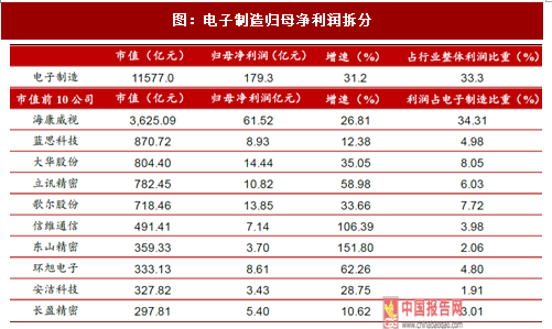 对电子制造板块净利润影响因素最大的公司是海康威视,前三季度净利润占电子制造净利润比重为34.31%,增速26.81%。其次,对电子制造净利润影响较大的公司还包括大华股份、歌尔股份、立讯精密等。