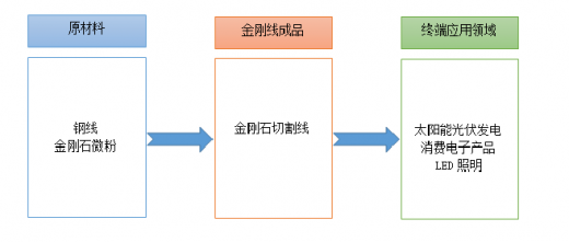 金刚石切割线产业是整个硬脆材料切割产业链的中间部分,它从上游钢线、金刚石微粉等企业购买原材料,加工成金刚石切割线后,出售给下游硅片、蓝宝石等硬物加工企业。