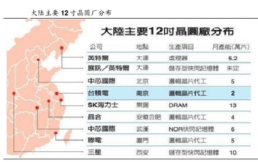 被中国庞大的市场需求所吸引,全球半导体大厂包括英特尔、联电、力晶、三星、海力士、中芯国际等均扩大在中国布局,根据统计,在大陆兴建的十二寸晶圆厂的总月产能超过 480000 片。晶圆代工龙头台积电南京厂投产后,大陆十二寸晶圆总月产能将超过 500000 片,相当于台积电一半以上的产能。