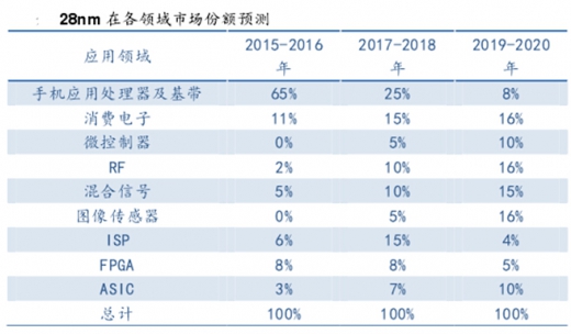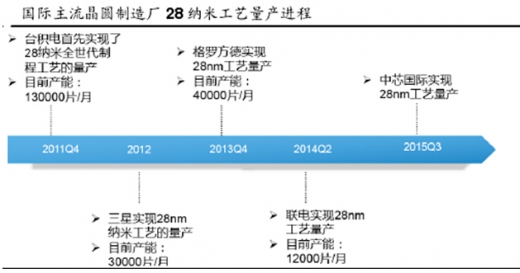 2011 年第四季度,台积电首先实现了 28 纳米工艺的量产。随后,三星于 2012年、格罗方德于 2013 年第四季度、联电于 2014 年第二季度、中芯国际于 2015年第三季度分别实现 28 纳米工艺的量产。截止 2014 年底,台积电是目前全球28 纳米市场中的最大企业,占全球 28 纳米代工市场份额的 80%。