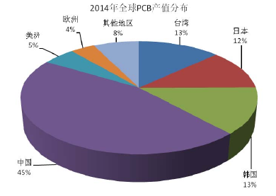 pcb产业在世界范围内广泛分布,欧美发达国家起步早,研发并充分利用先进的技术设备,故pcb行业得到了长足发展。近二十余年,亚洲地区的成本、资源等优势被逐步发掘,欧美发达地区逐步进行了产业结构调整,将pcb产能转移至包括中国大陆、中国台湾和韩国等亚洲地区。随着全球产业中心向亚洲转移,pcb行业呈现以亚洲,尤其是中国大陆为制造中心的新格局。2006年,中国超越日本成为全球pcb行业最大的生产基地。根据prismark数据显示,2014年中国占全球pcb产值的45.4%,预计占比仍将有所增长,到2019年中国产值占比有望达到50.3%。2014年全球pcb产值区域分布如下图所示: