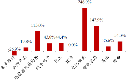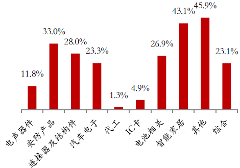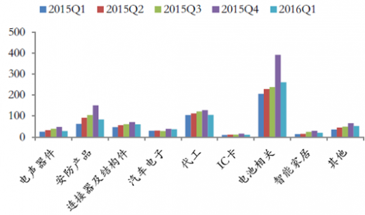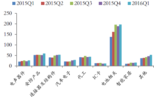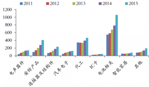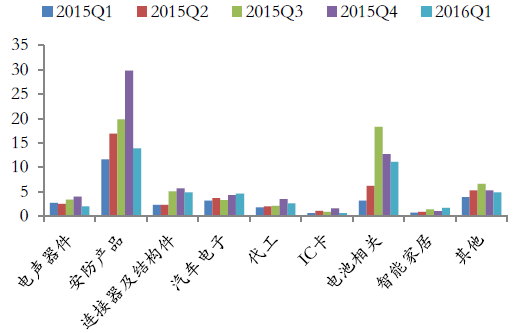 2015年度,其他应用器件所有细分领域均实现两位数的收入增长,其中安防产品和智能家居增速远高于行业整体增速。