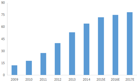 2、受益于各种专业设备的更新换代和在各行业的普及推广,过去几年中大尺寸触摸屏保持了快速增长,2014 年中大尺寸触摸屏销售收入约为64 亿美元,较上年增长20%。未来,传统的行业应用和专业设备,如自助服务设备(kiosk 一体机)、pos 机、atm 机等对触摸屏的需求将保持较为稳定的增长,而新兴的触摸电脑设备的快速发展,以及教育培训领域对交互式电子白板的强劲需求,将带动触摸屏需求快速增长。预计到2017 年中大尺寸触摸屏销售额将逼近80 亿美元。