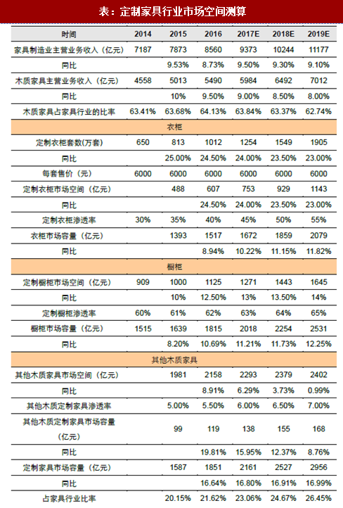 定制衣柜行业将持续快速成长。2014年我国定制衣柜销售套数为650万套,假设全国房屋年装修量1500万套,每套房屋配备1.5个衣柜,以此测算我国定制衣柜渗透率为30%左右。假设每套定制衣柜平均终端售价6000元,行业增速25%,2015年我国定制衣柜市场容量达到500亿元以上。未来几年定制衣柜的行业性增长为20%-25%,若达到50%左右的衣柜市场渗透率,2018年定制衣柜市场容量近1000亿元。