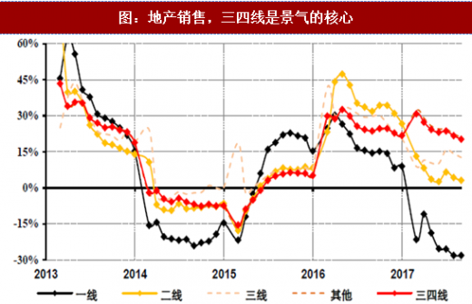 我们认为2018年地产小周期大概率见顶转弱,利率抬升居民杠杆逆转,将接力政策调控,成为地产景气筑顶转弱的核心驱动。本轮地产周期的启动与自企业向居民的杠杆转移密不可分,据新增个人住房贷款比销售额显示,较上一轮周期顶部约20%的杠杆,本轮平均杠杆率预计快速上升至50%左右。如此得以在总量人口基数下降的背景下,支撑其一轮完美超越之前的强销售周期。但加杠杆的销售周期有启动时也必有落幕时。2017年受监管政策、海外央行货币政策、通胀等因素影响利率中轴显著抬升,2018年类滞胀格局下利率仍易上难下,将继续引致房贷利率推升。历史来看,利率与销售端的负相关关系较为显著。当前高利率对销售的抑制已现端倪,而2018年这一冲击将更为显著,驱动地产整体景气下行。