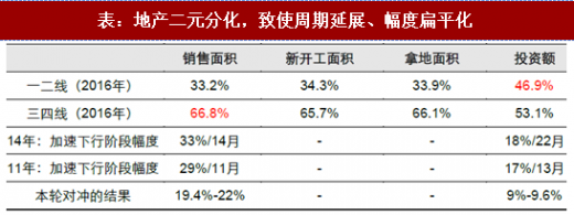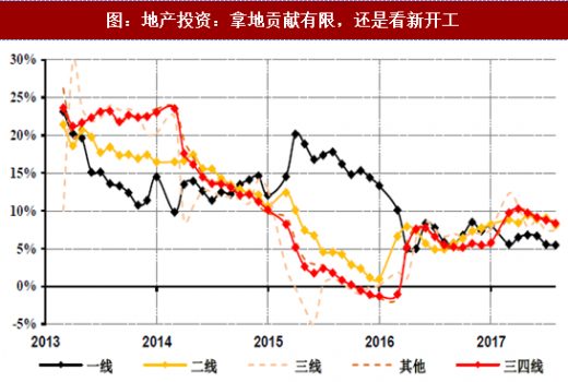转弱幅度上这一轮我们更为乐观,源于当前二元地产结构将有效对冲地产下行幅度,引致过往快下转而本轮稳下。从销售周期调整时长来看,当前一二线已经经历一年半的调整周期而处筑底回升态势,2018年全年有望呈现低位回升。而三四线仅于年中调整经历半年时长,预计2018年上半年将呈现快下的“最后一跌”,而于四季度起企稳筑底。参考前三轮周期分城市调整幅度,我们预计,2018年,地产销售先跌后稳,幅度约15%左右,全年销售增速预计约在-5%至-10%间。投资端将呈现拿地对开工的对抗,但整体趋势不改随销售景气转弱而下行。2017年,拿地强势惊艳市场,7月以来,住建部等九部门联合发文后,各试点城市出台了相应的配套措施,丰富了土地供应的渠道,提高供地力度。2018年,一二线城市土地供应量仍将进一步扩张,租赁住房市场将进一步发展,租赁住房供给占市场房地产总供给比例将稳步提升,正常商品房住宅用地土地供应预计也会增加。而另一边开工与施工将随销售同步转弱。结合来看,我们预计投资也将呈现前低后稳,止跌于三季度,新开工预计0至-5%间,地产投资增速预计在5%左右。