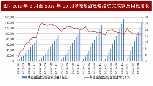 1-10 月全国基础设施投资 140811 亿元, 同比增长 15.85%,增速比 1-9 月份回落 0.03 个百分点,增速违续四个月放缓,与去年同期相比下降 1.74 个百分点。基建增速回落主要源于:1)财政部清理违规举债,地方政府融资行为受到规范;2)下半年 ppp 规范性加强,项目入库、落地速度放缓;3)流动性收紧,融资成本提升,影响项目落地;4)下半年环保限产,项目开工搁置、放缓;5)经济延续稳中向好态势,基建稳增长作用减弱。在生产增长、出口回暖、制造业投资企稳的背景下,具有逆周期特彾的基建投资增速有可能存在下滑的压力。