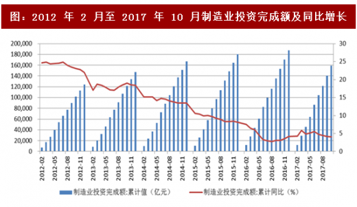 1-10 月份,投资 158856 亿元,同比增长 4.1%,增速比 1-9 月份下降 0.1 个百分点,比去年同期提高 1 个百分点,制造业整体呈现企稳回升态势。制造业投资企稳主要源于电器机械及器材、汽车等中游装备制造业回暖的拉动,企业利润改善、投资意愿增强。十九大报告再度强调深化“供给侧改革”,推进我国由“制造大国”向“制造强国”转发,随着产能出清,预计 2018 制造业投资有望回暖,增速有望维持在 6%左右。