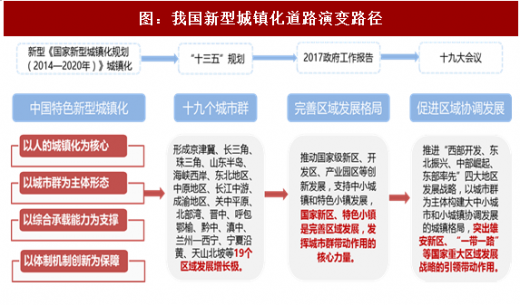 国家新区、特色小镇是完善区域发展,发挥城市群带动作用的核心力量。2017 的政府工作报告中又进一步指出,要完善区域发展格局,扎实推进新型城镇化,推动国家级新区、开发区、产业园区等创新发展,支持中小城镇和发展,发挥城市群带动作用。党的十九大会议提出,地区发展不平衡是新时代社会主要矛盾的重要组成部分。实施区域协调发展战略,推进新型城镇化发展,是党的十九大后的重要发展方向,重要措施包括持续推进“西部开发、东北振共、中部崛起、东部率先”四大地区发展战略,以城市群为主体构建大中小城市和小城镇协调发展的城镇格局,突出雄安新区、“一带一路”等国家重大区域发展战略的引领带动作用。伴随着,我国对中国特色新型城镇化建设的摸索与践行,雄安新区、特色小镇、“一带一路”等区域发展举措,将为建筑行业带来新的发展动力。