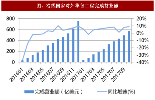“一带一路”建设取得阶段性成果,沿线国家对外承包工程业务新签合同额保持高速增长。2016 年“一带一路”沿线国家新签对外承包工程业务合同额为 1260.3 亿美元,同比增速为36%。2017年1-10月沿线国家新签对外承包工程业务合同额达1020.7 亿美元,同比增长 21%。2016 年,沿线国家新签对外承包工程业务合同额总我国对外承包工程新签合同额比重为 51.6%,2016 年这一总比提高至 55.4%。“一带一路”沿线国家对外承包工程业务成为推动我国对外承包工程业务扩张的核心力量。