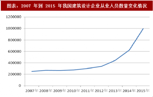 近几年,我国建筑设计行业规模持续扩大,从业人员队伍不断发展壮大。2015 年我国建筑设计类企业数量为 4,856 家,2015 年建筑设计从业人员数量为 997,193 人。