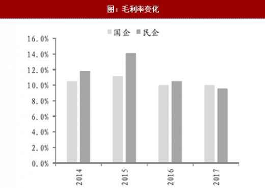 首先来看影响盈利空间,从而对现金流增量产生影响的毛利率的情况。从毛利率水平来看,国有略弱于民营,表现出国企工程重民生轻盈利的特点,因而需要以规模效应来弥补;而趋势上,近3年无论是国有还是民营,毛利率都逐年下降,国有由2015年的11%降至10%左右,民营由14%大幅降至9%,对其货币充足性造成负面影响;主要原因是供给侧改革环境下,上游水泥、钢材等价格上升显著,同时劳动力成本逐渐上升。