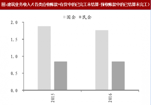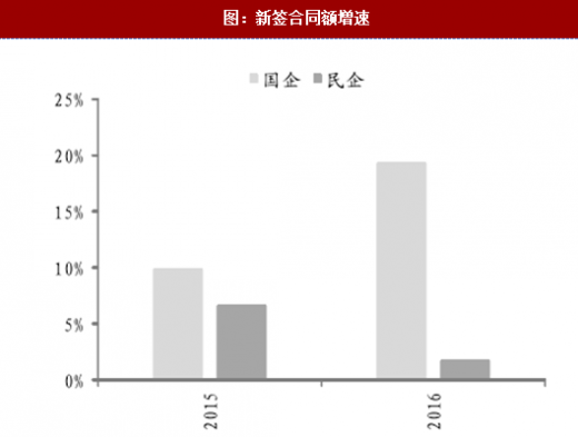国有的新签合同金额的增速2016年显著高于2015年,而民营则出现了增速的下降。由于国企承接基建类项目较多,而2016年起在ppp推广背景下,不少国企的新签订单中ppp类大幅增加,其整体新签合同金额增速上升。