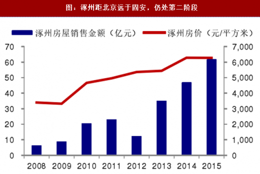 京津冀城市群内除却京津,缺乏核心二级城市,那些从北京溢出的产业与人口无处安放,他们无法远离。注定了到北京的距离是决定房地产市场的主要因素。京津冀城市群内,以廊坊固安和保定涿州为例。这两个城市的经济发展水平接近,最大的区别在于距北京的距离。固安距北京约50公里,涿州距北京约80公里。囿于数据的可得性,选取2008-2015年的数据分析。