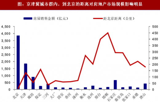 图:京津冀城市群内,到北京的距离对房地产市场规模影响明显