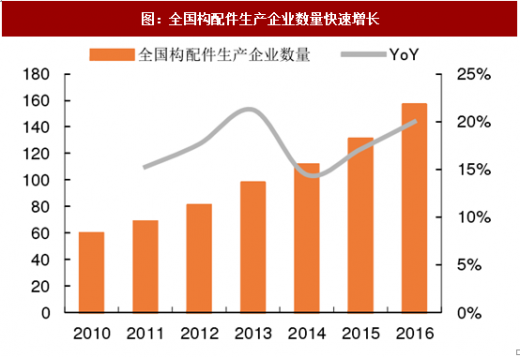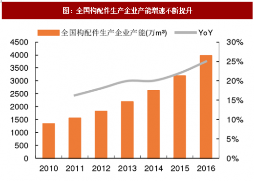 预制装配式技术持续推广,预制混凝土构件产能快速扩张。我国预制混凝土技术标准编制历时10年左右,截至目前预制混凝土领域的国家和行业标准已基本齐备,现行的预制混凝土结构设计、构件生产、结构施工、工程验收等系列标准完全可以指导我国建筑工程领域的装配式结构工程实施。2010年以来,全国各地企业开始抢滩建厂,预制构件厂数量以及预制构件厂产能保持快速增长。截止2016年底,我国拥有预制构件厂数量达156个,同比增长20%,全国构配件生产企业产能达3950万m,同比增长25%。