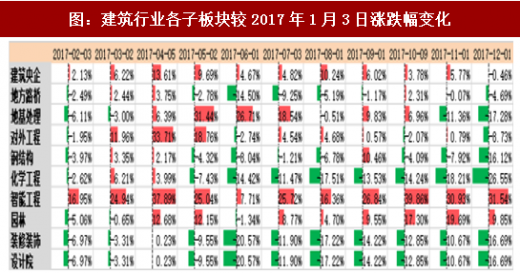 2017年伊始,在基建增速的相对强势、ppp项目的大量释放、以及一带一路大会即将召开等因素影响下,2017年一季度部分建筑上市企业营收增速处于高位,叠加房地产投资的超预期增长,建筑板块在进入2017年以来至4月初迎来大幅上涨,幅度约为13%,同期沪深300指数涨幅为5.23%。在一带一路风口、以及基建投资增速相对强势的影响下,其中建筑央企、对外工程以及园林相关板块均有不错涨幅。