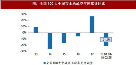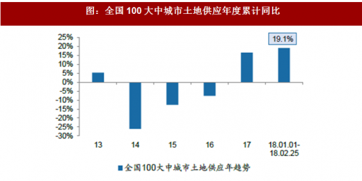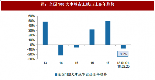 由于统计数据的滞后因素,我们统计的土地市场供需数据相对商品房成交均滞后一周。根据全国100大中城市数据,2018年第8周(春节)受假期因素影响,供给方面,供应总面积为321.8万方,累计数据来看,18年前8周供应面积同比上涨19.1%。成交方面,2018年第8周全类型土地成交面积704万方,分线来看,主要为三线城市土地成交。累计来看,18年前8周土地成交面积同比下滑21.2%。而出让金方面,18年第8周,100大中城市土地成交出让金60.69亿元,累计数据来看,18年前8周土地出让金同比下滑8%。综合供给和成交,土地供销比降至0.97,住宅土地供销比降至0.91。
