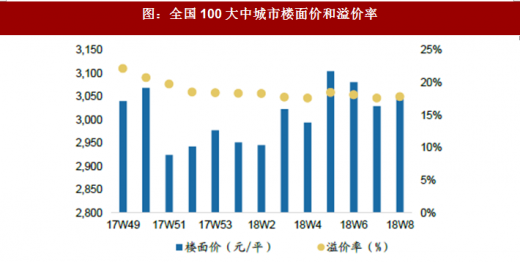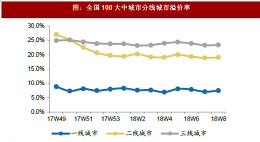 从溢价率的角度来看,2018年第8周全类型土地成交溢价率(移动平均3个月)为17.9%,环比小幅回升1.3%。分线来看,一线、二线、三线溢价率分别为7.5%、19%、23.4%,与上周相比溢价率环比均上升,一线、二线、三线环比分别上涨5.4%、0.7%、0.5%。而住宅用地溢价率(移动平均3个月)为21.3%,环比小幅上升1.9%,分线来看,一线城市环比显著上升7.9%,而二线、三线分别环比上升1.1%、0.4%。