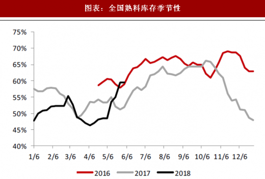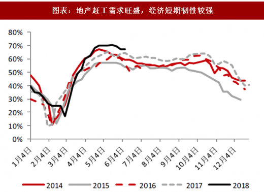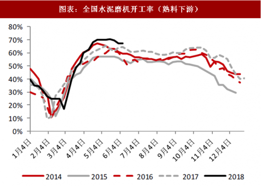 草根调研了解,今年 3-4 月份以来,房地产行业赶工加快周转意图较为强烈。全国水泥磨机开工率自 4 月中旬以来一直处于季节性高点。但随着 5 月份环保、天气、雨季等因素影响,下游需求环比快速回落。水泥熟料库存也同步快速攀升至同期正常水平。但考虑 6 月中下旬后停工因素渐退,下游赶工需求或在6月中下旬再度释放。