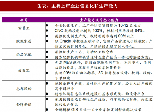 定制家具是、规模化生产的个性化板式家具,因此对于定制家居 企业来说,如何实行个性化产品大规模机械化生产是基本问题。随着信息技术的进步,部分家具生产厂商借助信息系统、自动加工系统等,将数字控制 加工设备转变为能根据加工指令智能操作的自动化机械制造系统,实现了柔 性化生产,解决了上述难题。企业信息化建设对于定制家居企业同样重要, 应用信息化技术,能够实现从产品设计到产品生产发货的各环节紧密衔接, 提高各环节的工作效率,从而缩短生产周期。