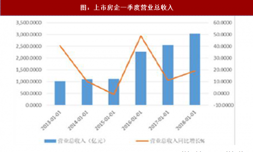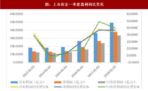 而 18 年一季度上市房企实现营业总收入为 3031.69 亿,较去年同期增长 19.16%;实现营业利润、净利润、归属母公司股东净利润则分别为 492.11 亿,379.43 亿和 334.57 亿,分别同比上升 34.02%,上升 36.81%和上升 39.92%。一季度上市房企结算利润及归属净利润出现大幅上升,盈利创出季度历史新高,情况同样令人满意。